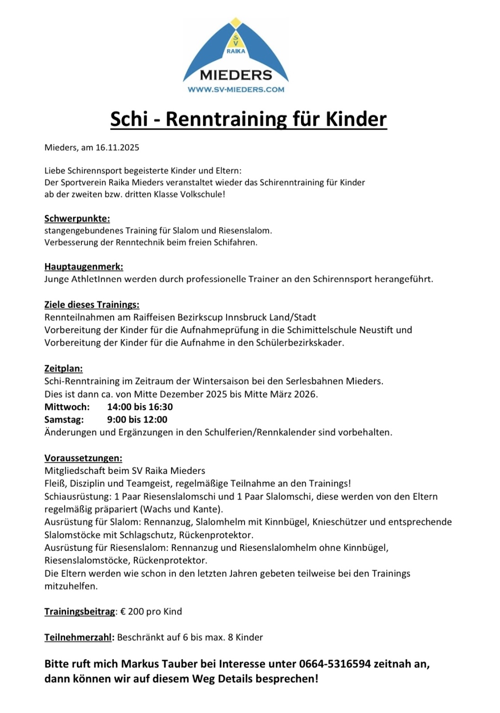 Der SV Raika Mieders hat als Neuerung diese Saison drei kompetente, angehende TrainerInnen und bereits z.T. ausgebildete SchilehrerInnen engagiert.